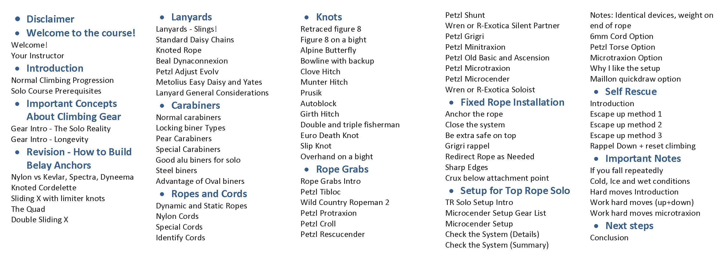As an Instructional Designer working constantly with the design and development of college-level, online courses, I can personally vouch for Yann’s thorough, educational, and inspiring content and delivery. The topics are well organized, and I have viewed many of his videos where I have always learned something to help add to my skillset, and I’ve been climbing over 30 years! If you’re wondering, “Is it possible that an online course can help me get a better understanding of rope-soloing?” The answer to your question is an emphatic “YES!”